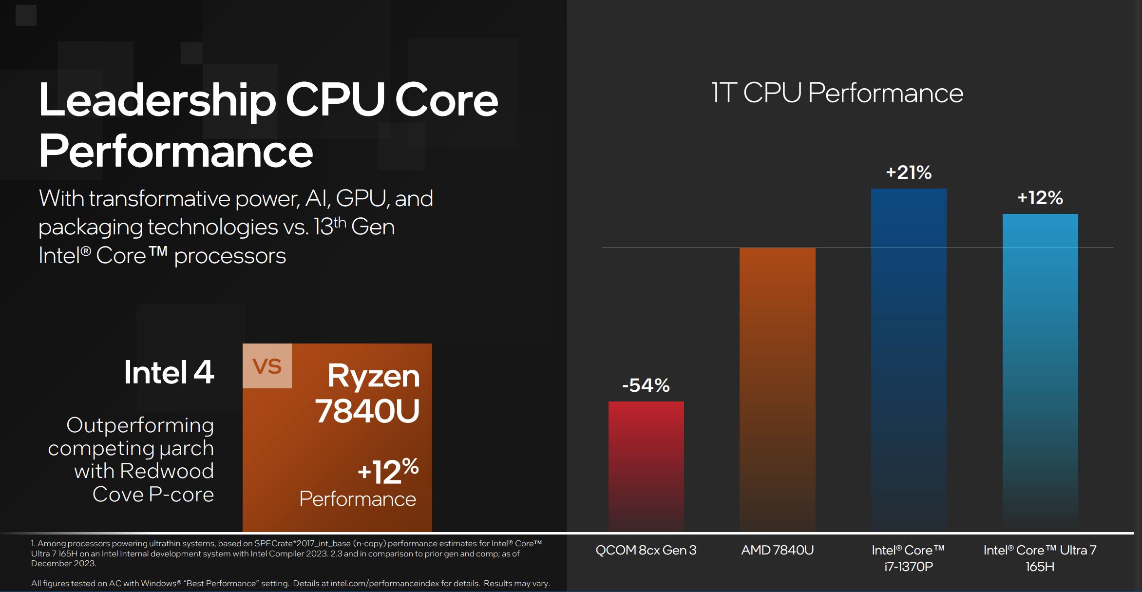 현재는 검증되지 않은 인텔의 자체 테스트를 통해서만 메테오 레이크의 성능을 짐작할 수 있다. 인텔은 인텔 코어 울트라 7 165H를 탑재한 메테오 레이크 기반 코어 울트라 노트북이 단일 스레드 CPU 성능에서 AMD 7840U를 12% 앞선다고 밝혔다. 하지만 이전 세대인 인텔 코어 i7-1370P는 7840U보다 21% 더 빨랐다.