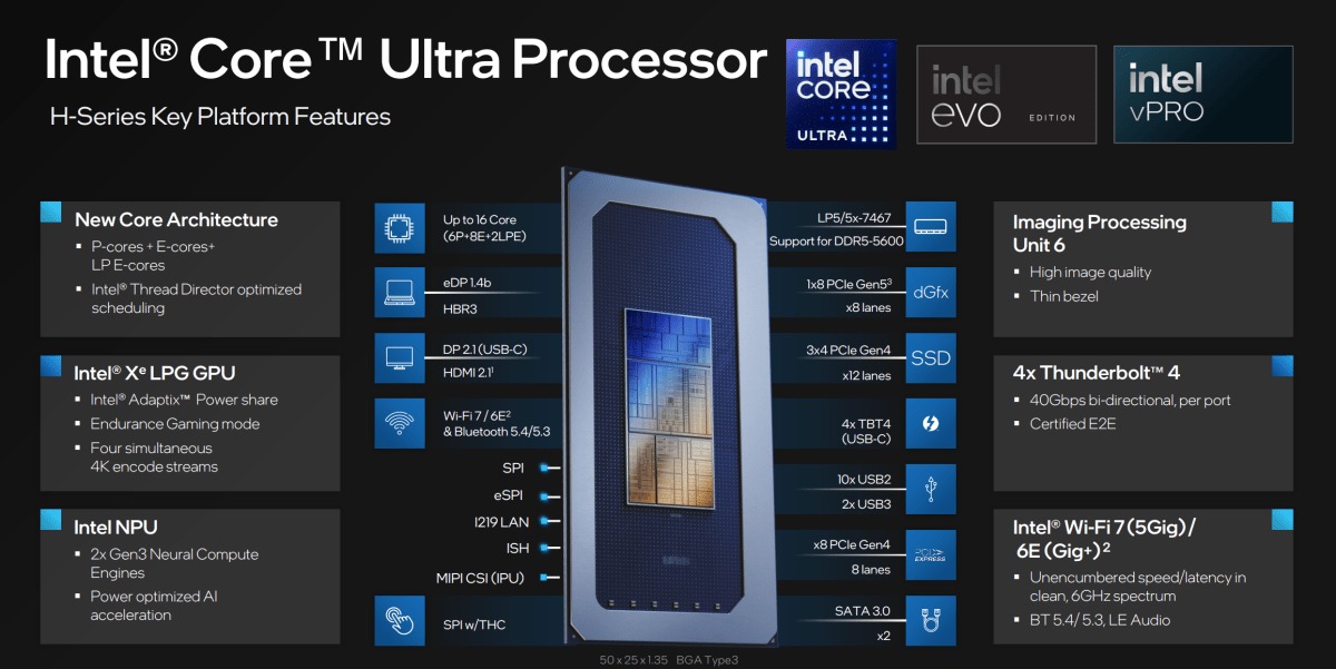 인텔 14세대 코어 울트라 칩이 탑재된 노트북은 몇 가지 예외 사항을 제외하면 이전 세대를 연상케 한다. 앞서 인텔은 코어 울트라 플랫폼의 메테오 레이크 세대에는 썬더볼트 5가 포함되지 않지만, 기존의 2개가 아닌 4개의 썬더볼트 4 포트를 지원할 계획이라고 밝힌 바 있다. 마찬가지로 노트북 제조업체가 개별 카드를 설치하지 않는 한 와이파이 7은 지원되지 않으며, 이 경우 와이파이 6E를 지원한다.