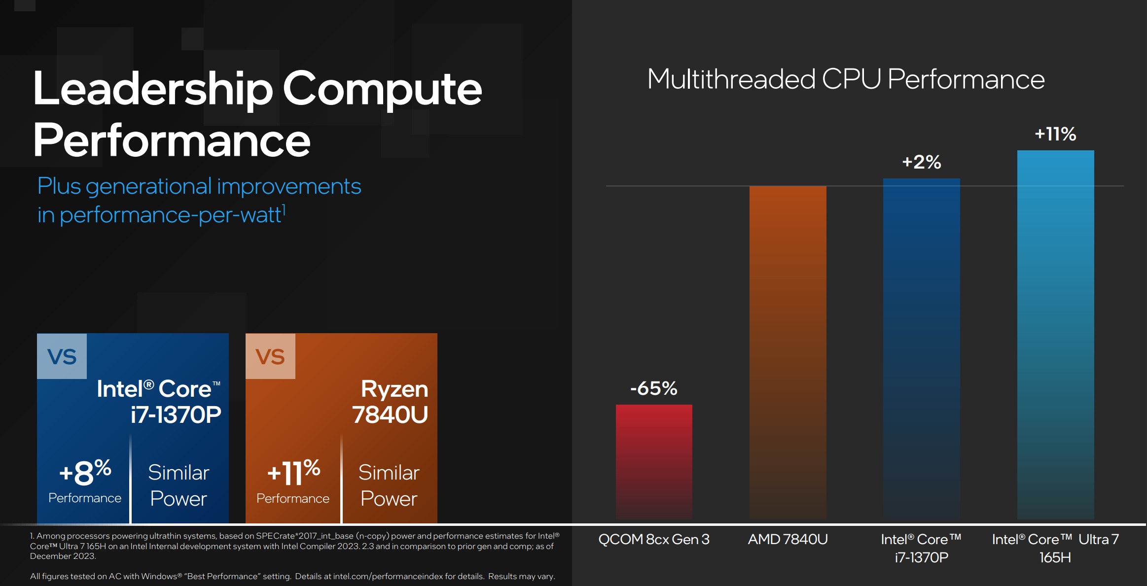 인텔은 코어 울트라를 진정으로 향상시키는 것이 GPU 성능이라고 강조했다. 회사에 따르면, 코어 i7-1370P와 비교했을 때 코어 울트라 7 165H는 발더스 게이트 3(Baldur’s Gate 3)에서 최대 100%의 성능을 발휘했으며(1,080p 해상도, 중간 설정), 울트라씬 노트북에서 AMD 라이젠 7 7840U와 거의 동일한 수준의 성능을 제공했다.