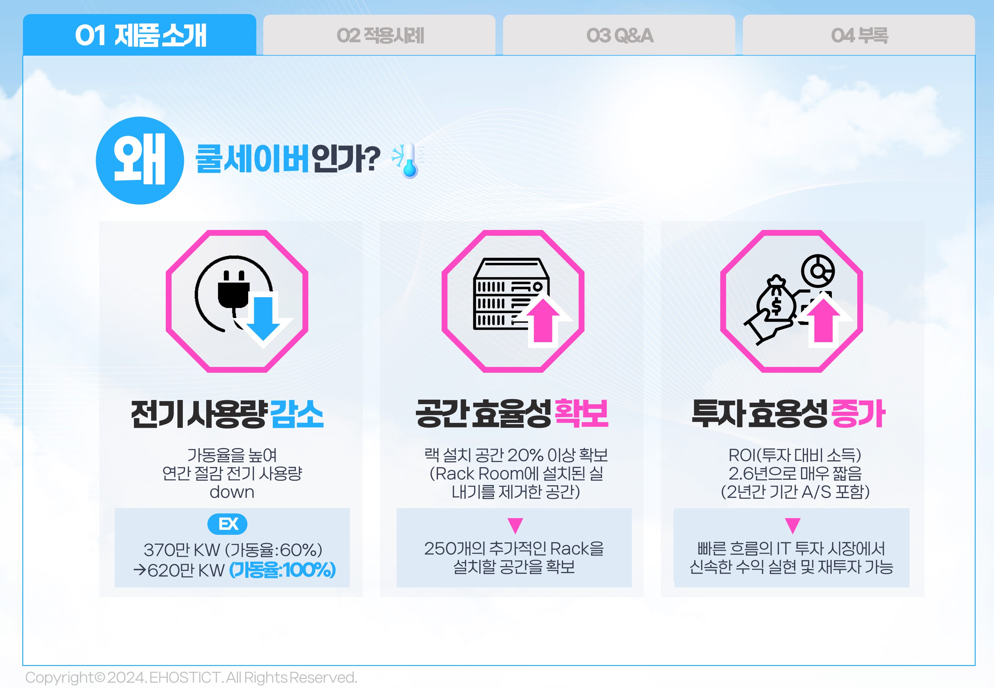 데이터센터 에너지절감솔루션 "쿨세이버"는 전력 가동율을 높여 연간 절감 전기 사용량을 낮추는 기능을 합니다. 랙설치공간 20% 이상을 더 확보할 수 있어 공간 효율성 부문에 있어서도 훌륭한데요. ROI(투자 대비 소득) 또한 약 2.6년으로 매우 짧습니다.