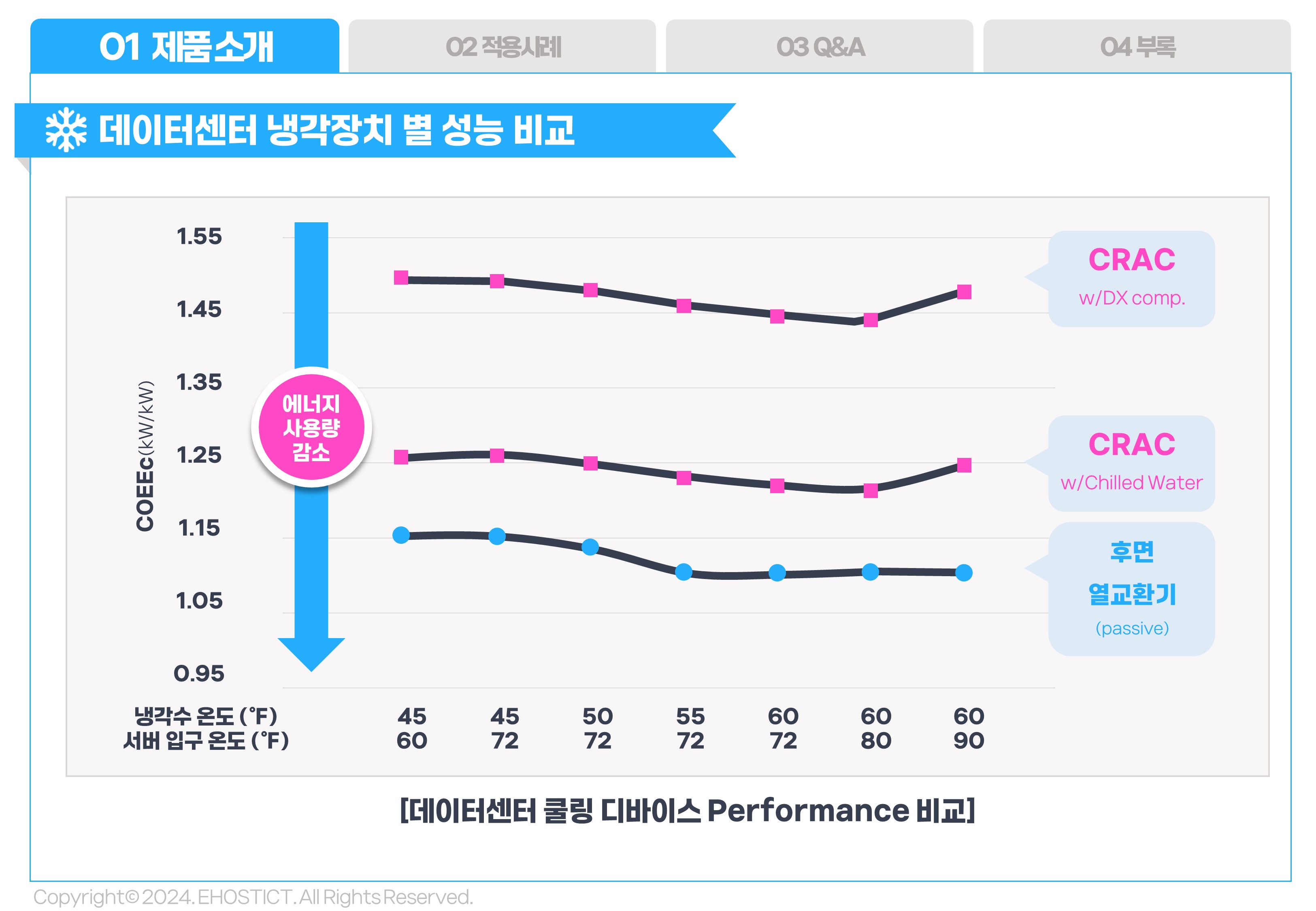 기존에 흔하게 사용하는 IDC 냉각시스템인 CRAC(Compute Room Air Conditioner)와 소모 전력량을 연간 단위로 비교해보면 위 내용과 같은데요. 부하 가동율에 따라 3.8~3.9배 가량 비용 절감이 이루어지지요.