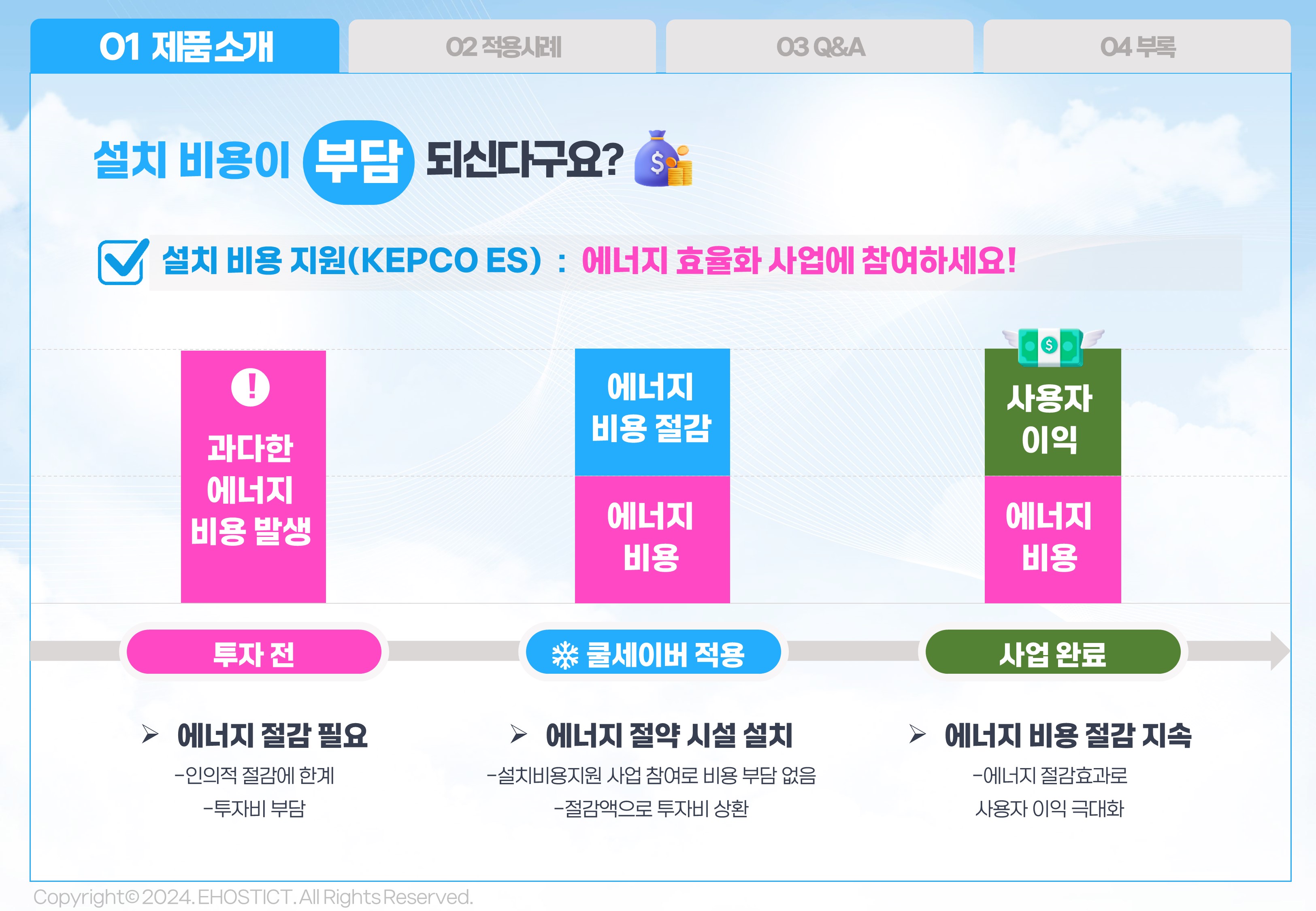 설치비용지원(KEPCO ES) 에너지 효율화 사업에 참여한다면 투자 비용 없이 설치가 가능합니다.