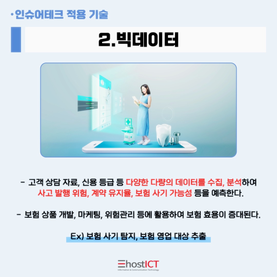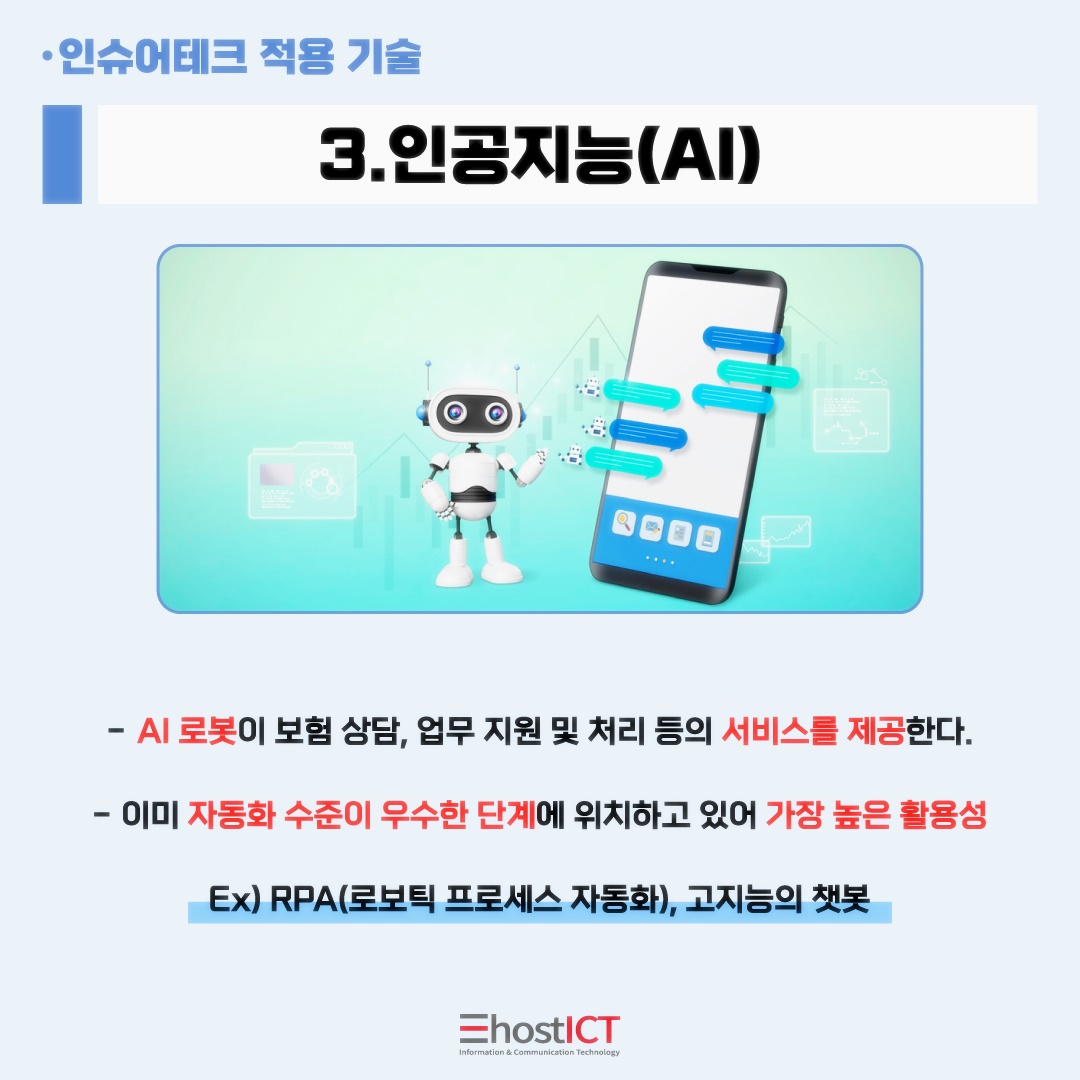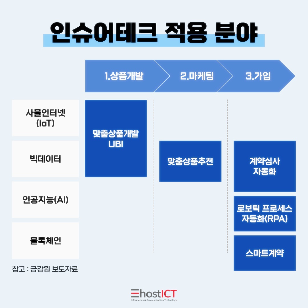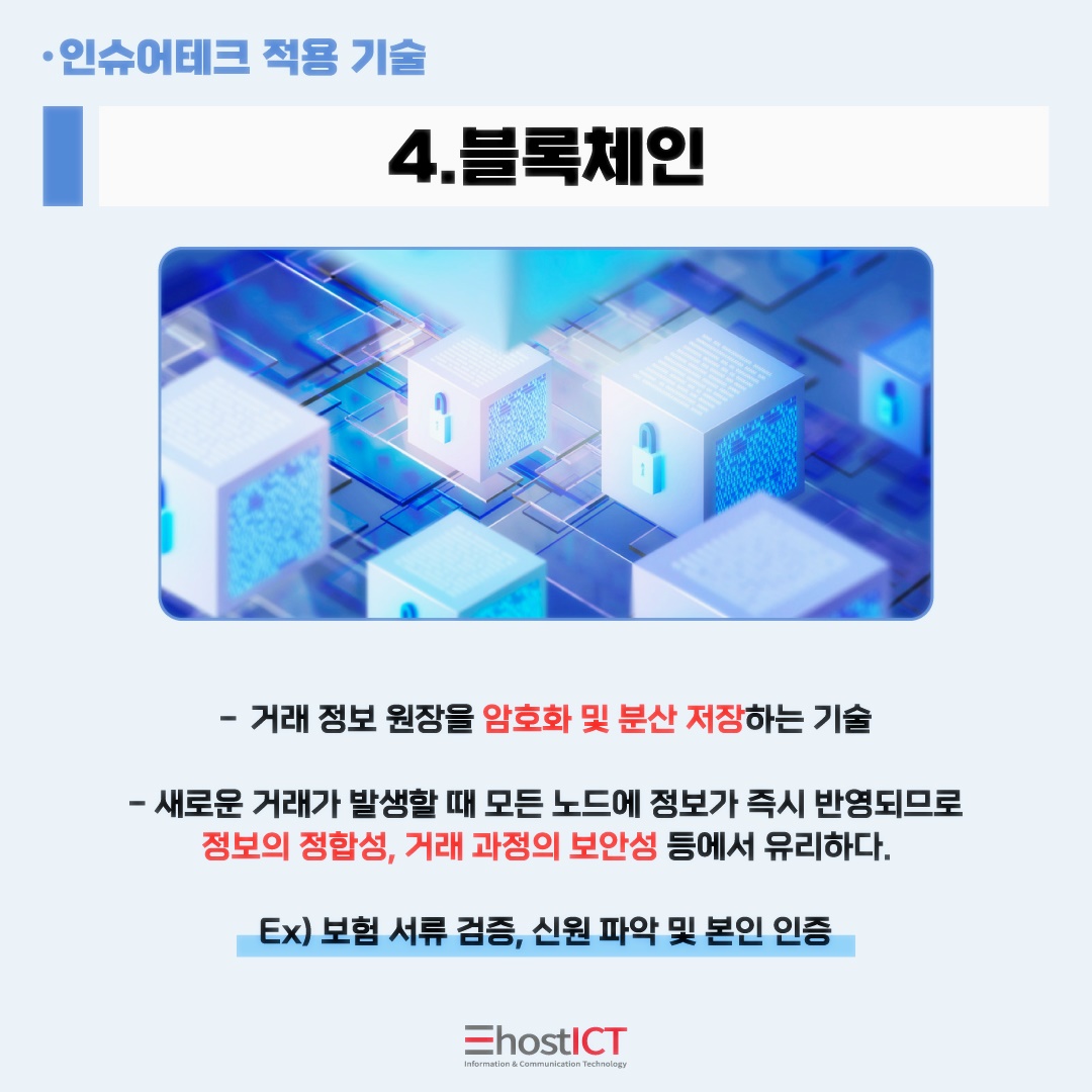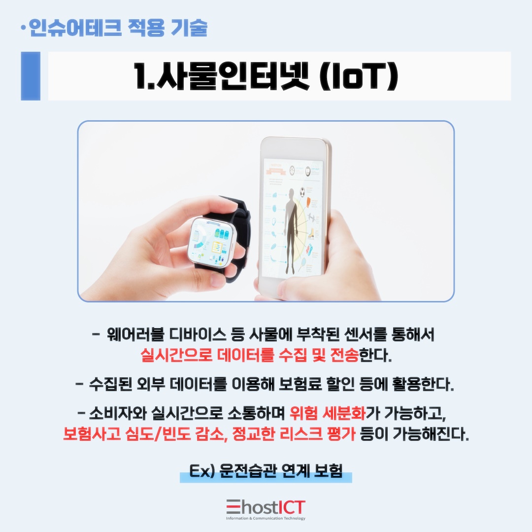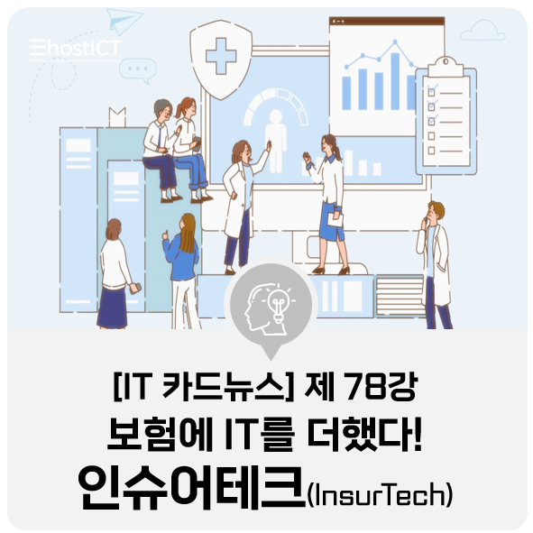 인슈어테크는 보험(insurance)과 기술(technology)의 합성어인데요. 이른바 '보험의 혁명' 이라 불리우는 인슈어테크. 그 정체에 대해 이호스트ICT의 IT 카드뉴스와 함께 지금 바로 알아보시죠!