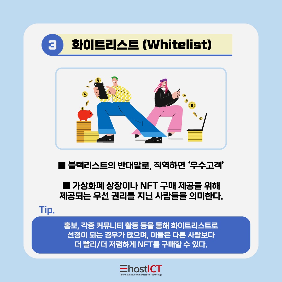 보통 이 목록에 오를 수 있는 조건은 다양하며, 특정 커뮤니티에 속해 있거나, 일정 기간 동안 특정 활동을 한 사람들이 이 목록에 오를 수 있습니다. 화이트리스트에 오른 사람들은 일반인보다 먼저 또는 특별한 조건으로 NFT를 구매할 수 있는 기회를 얻게 됩니다.