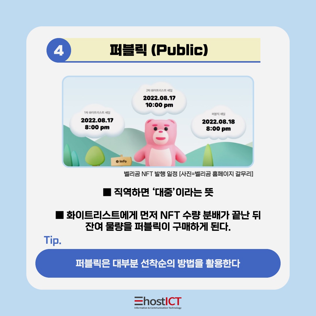 퍼블릭은 직역하면 '대중' 이라는 뜻으로, NFT 구매 기회가 모두에게 열려있다는 것을 의미합니다. 화이트리스트 판매가 끝난 후에 진행되는 경우가 많으며, 이 때는 일반인도 NFT를 구매할 수 있는 기회를 얻게 되는데, 대부분 선축순의 방법을 활용하게 됩니다.