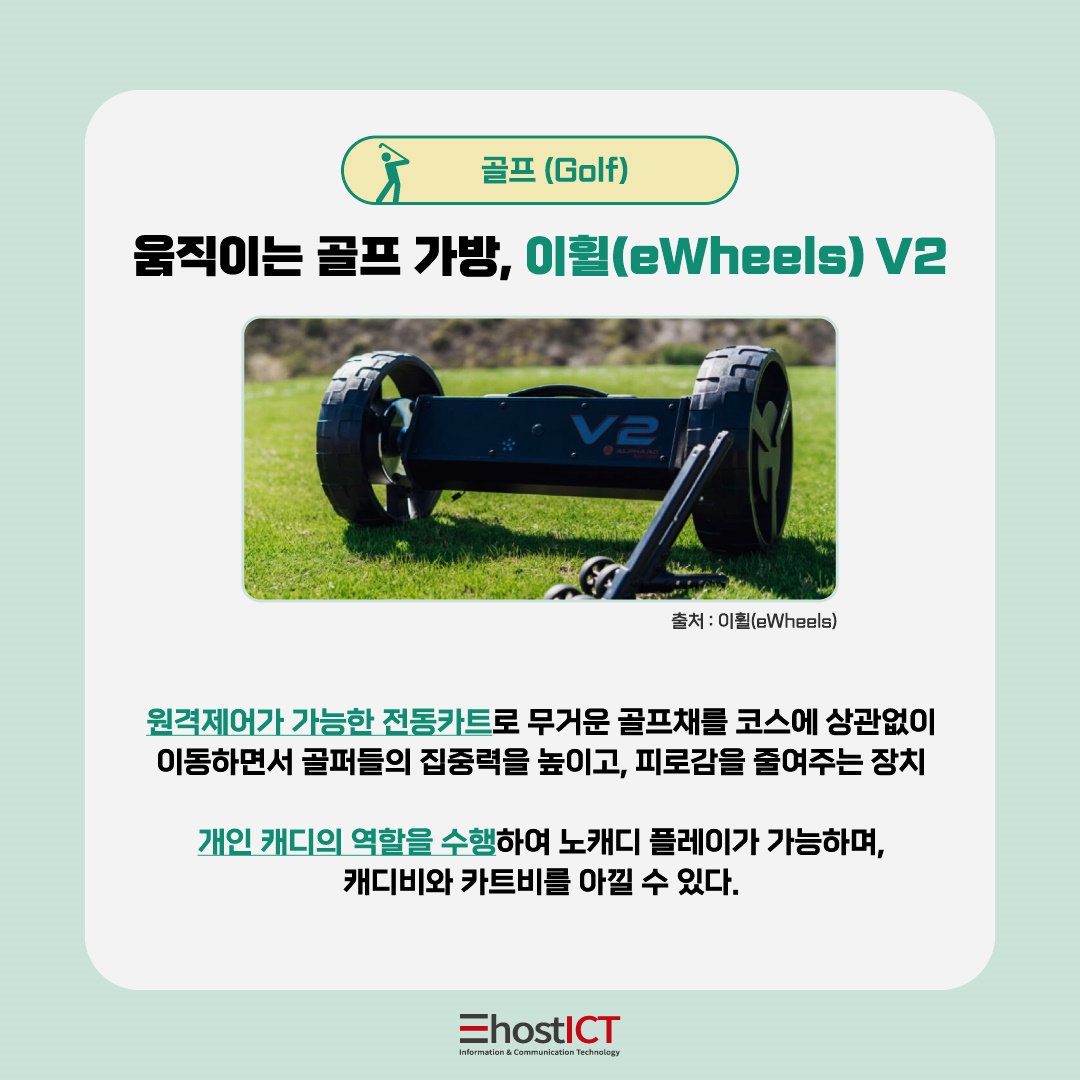 이휠(eWheels) V2는 알파드 골프(Alphard Golf)사에서 제작한 혁신적인 골프 가방 운반 솔루션으로, 캐디백을 설치한 푸시카트를 리모콘으로 제어하거나 자동으로 골퍼를 따라다니는 스마트 캐디 기능을 제공합니다.
