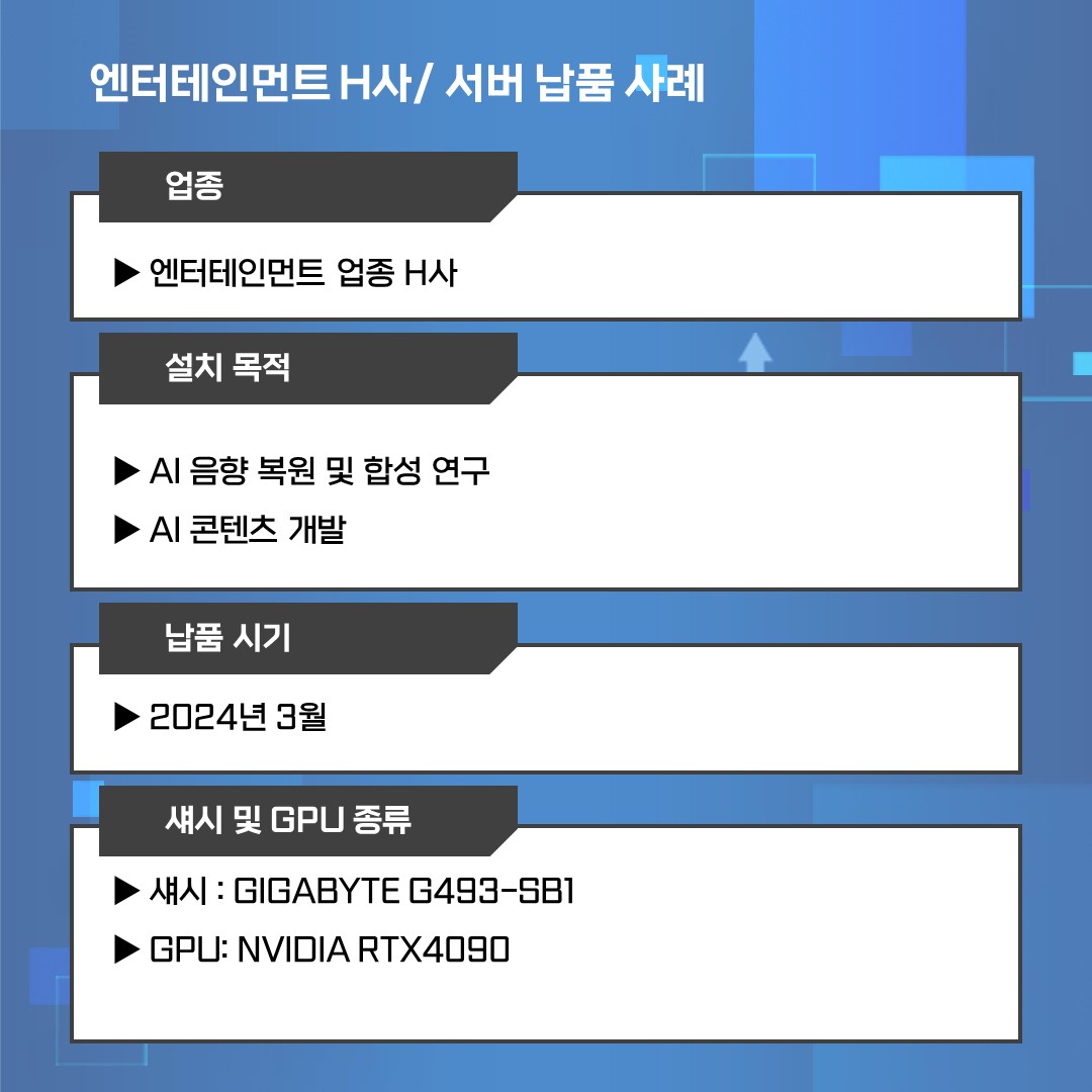 엔터테인먼트 H사 / AI 음향 및 콘텐츠 연구개발 위한 GPU 서버 납품 사례