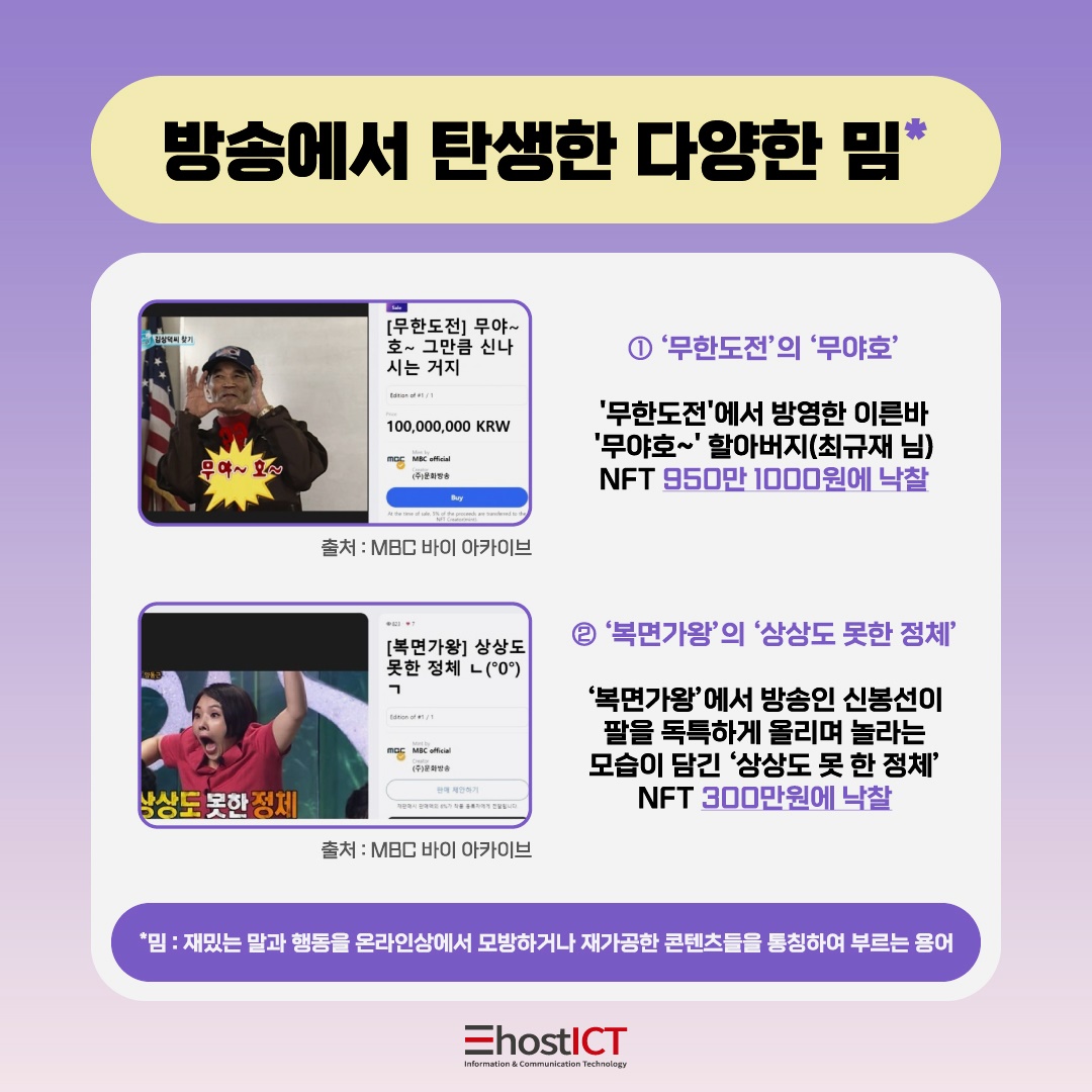 방송 프로그램에서 탄생한 유명한 밈들이 NFT(Non-Fungible Token, 대체불가능한 토큰)로 제작되어 디지털 소장품 시장에서 주목받고 있기도 합니다.