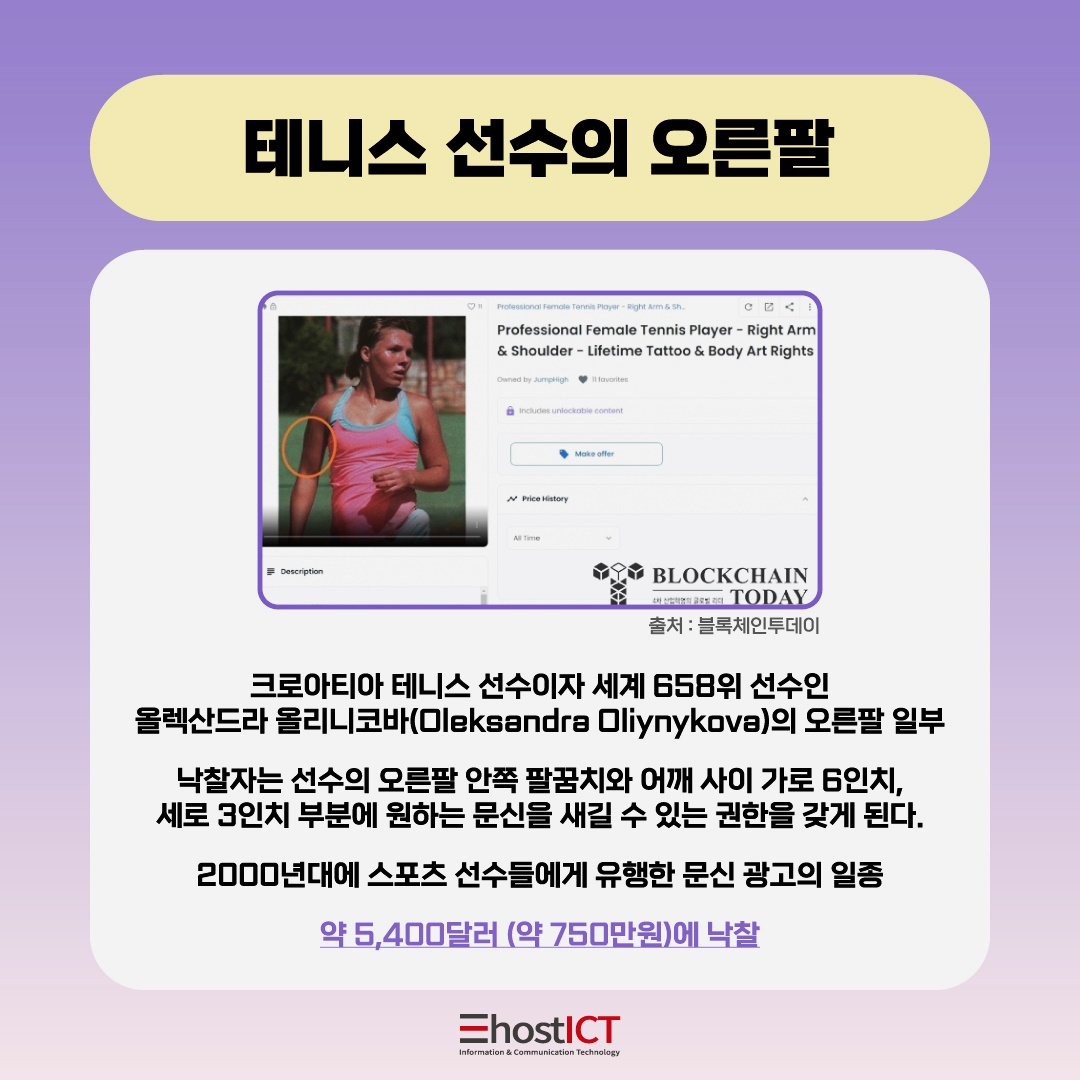 우크라이나의 프로 여자 테니스 선수이자 세계 658위인 올렉산드라 올리니코바는 자신의 오른팔 일부를 NFT로 판매하였습니다. 낙찰자는 선수의 오른팔 안쪽 팔꿈치와 어깨 사이 가로 6인치, 세로 3인치 부분에 원하는 문신을 새길 수 있는 권한을 갖게 되는 방식이었는데요. 2000년대에 스포츠 선수들에게 유행한 문신광고의 일종으로 NFT가 활용된 것입니다. 이는 약 5,400달러(한화 약 750만원)에 낙찰되었습니다.