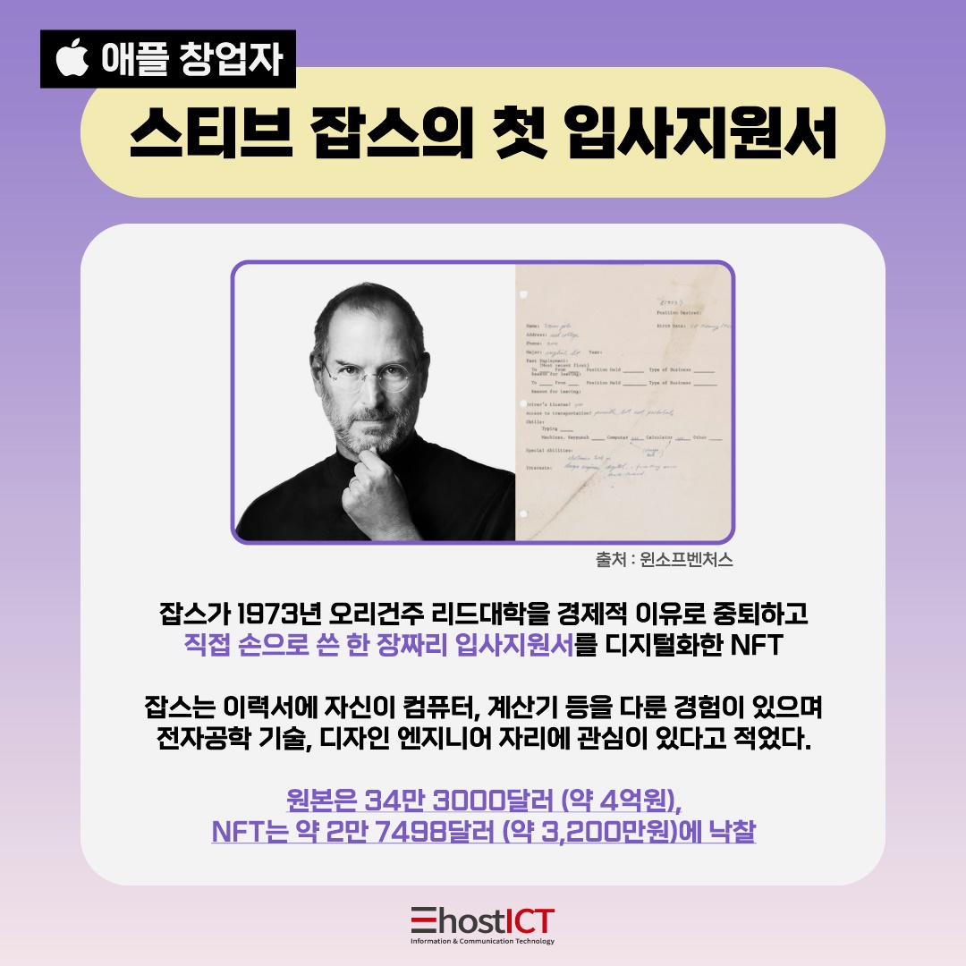 스티브 잡스가 1973년 오리건주 리드대학을 경제적 이유로 중퇴하고, 직접 손으로 작성한 한 장짜리의 입사지원서를 디지털화한 NFT입니다. 원본은 34만 3,000달러 (한화 약 4억원), NFT는 약 2만 7,498달러(한화 약 3,200만원)에 낙찰되었다고 하는데요. 잡스는 이력서에 자신이 컴퓨터와 계신기 등을 다룬 경험이 있으며 전자공학기술, 디자인엔지니어 직무에 관심이 있다고 적었다고 합니다.