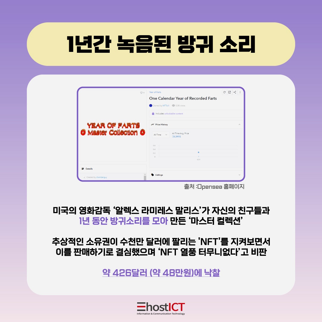 미국의 영화감독 '알렉스 라미레스 말리스'는 자신의 친구들과 1년 간 방귀소리를 모아 마스터 컬렉션을 만들었습니다. 방귀 소리를 1년 간 녹음하여 NFT로 제작한 것인데요.
