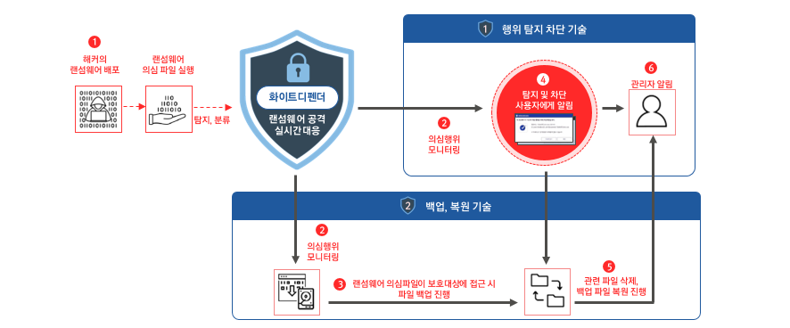 화이트디펜더는 알려지지 않은 랜섬웨어까지 원천적으로 차단하고 안전하게 보호합니다. 엔드포인트 시스템에서 랜섬웨어 관련 의심 행위가 발생하는 경우, 랜섬웨어를 탐지-차단하며, 랜섬웨어가 암호화를 진행할 경우 순간적으로 원본파일을 백업하고, 차단 후 백업된 파일을 복구하는 행위를 통해 데이터를 안전하게 보호하는 역할을 수행합니다.