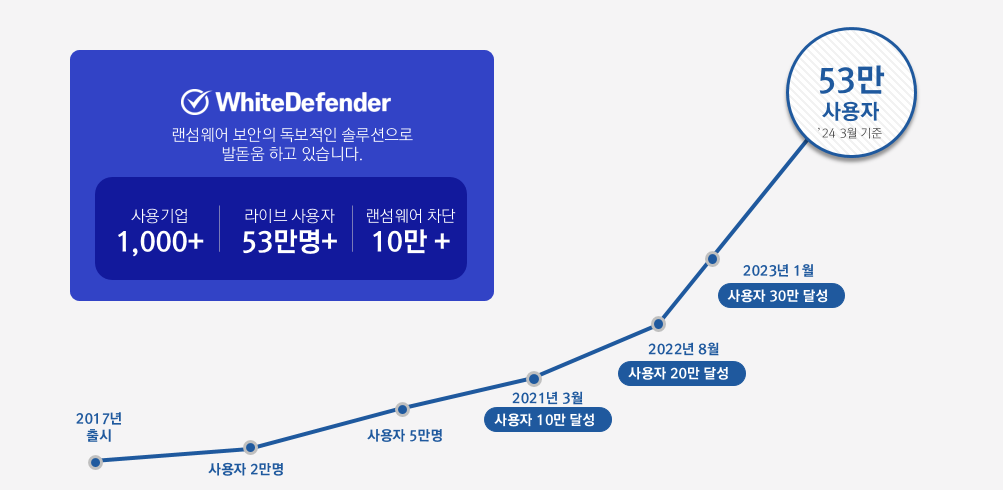 사이버 보안이 최대 이슈인 만큼, 랜섬웨어 보안을 위해 화이트디펜더를 찾고 활용해주시는 고객분들은 꾸준히 늘고 있습니다. 랜섬웨어 보안의 독보적인 솔루션으로 발돋움하고 있으며, 2017년 출시 이후 현재 글로벌 53만 고객과 함께 하고 있습니다.