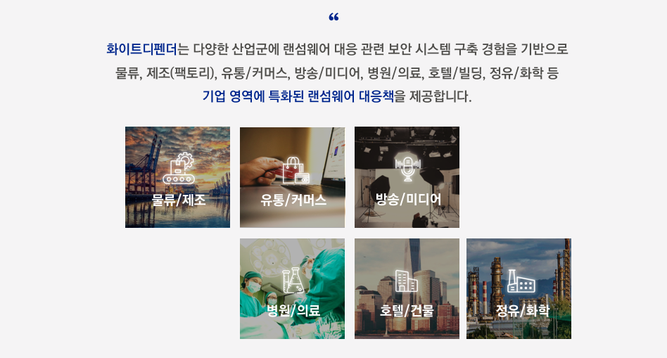 비즈니스 연속성을 유지하기 위해 필수 솔루션인 안티랜섬웨어 솔루션 화이트디펜더는 다양한 산업군에 랜섬웨어 대응 관련 보안 시스템 구축 경험을 지니고 있습니다. 이를 기반으로 물류, 제조(팩토리), 유통/커머스, 방송/미디어, 병원/의료, 호텔/빌딩, 정유/화학 등 기업 영역에 특화된 랜섬웨어 대응책을 제공합니다. 기타 산업군에 대해서도 정보 보안이 필요한 분야라면 어디든 효율적인 활용이 가능합니다.