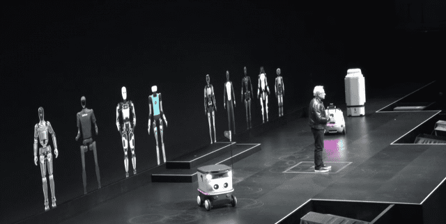 이 가운데 뉴빌리티의 자율주행 로봇 ‘뉴비’가 젠슨 황 CEO 옆에서 주행하는 모습도 볼 수 있었다. 엔비디아가 지난 3월 프로젝트 ‘그루트’를 공개하던 때와 마찬가지로, 수많은 휴머노이드 로봇 영상을 무대 뒤쪽에 띄운 채로 실물 로봇을 선보였다.