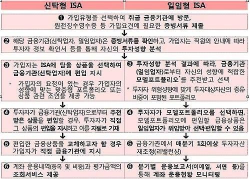 ISA는 고객이 투자 상품을 직접 결정하는 신탁형과 금융사가 투자자에게 모델 포트폴리오(MP)를 제시하고서 투자권을 위임받는 일임형 등 2종류로 출시된다.
