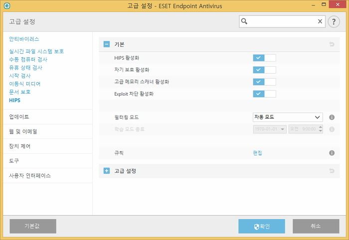 -HIPS(호스트기반 침입 차단 시스템) 는 네트워크 필터링의 검출 기능과 고급 동작 분석 기능을 동시에 수행하여 실행중인 프로세스, 파일, 레지스트리 키를 보호합니다
