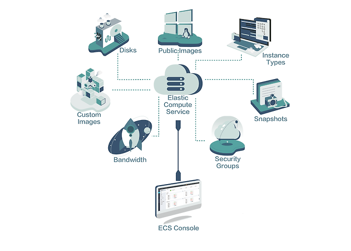 ECS 인스턴스는 가상 컴퓨팅 환경으로서 CPU, 메모리, 그리고 다른 기본적인 컴퓨팅 요소들을 포함합니다. 인스턴스는 ECS 의 코어 컴포넌트이며, Alibaba 클라우드가 제공하는 실제적인 운영 개체입니다. 디스크나 이미지, 스냅샷 또한 ECS의 자원에 포함됩니다.