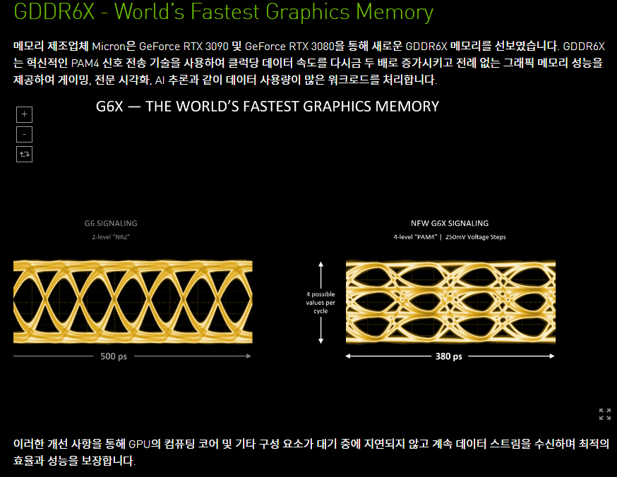 GDDR6X는 혁신적인 메모리 기술을 적용하여 더 빠르고 적은 지연으로 데이터를 처리할 수 있게 하였습니다. 이는 급증한 CUDA core의 연산을 충분히 커버하여 AI 학습의 속도를 극대화 할 수 있게 적용된 기술일거라고 추측해봅니다.