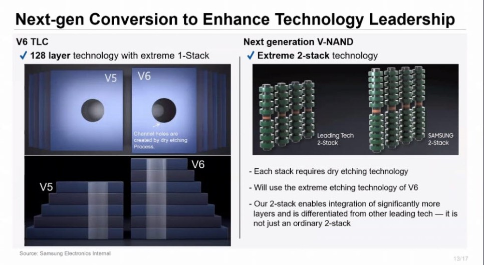 한 전무는 더블스택 기술이 기존 대비 공정 수 증가로 단가가 최소 10% 오른다면서도 "평범한 더블스택 기술이 아닐 것"이라고 강조했다. 같은 더블스택이라 해도 타사와는 확실한 차이점이 있다는 설명이다. 한 전무는 "지금까지 삼성이 구현한 낸드플래시의 높이는 경쟁사 대비 낮아 기술 경쟁력이 있다"고 덧붙였다.