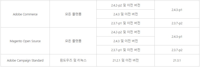 ※ 아래의 Adobe 참고사이트에서 “Solution”의 “Availability” 항목 참고하여 업데이트 수행