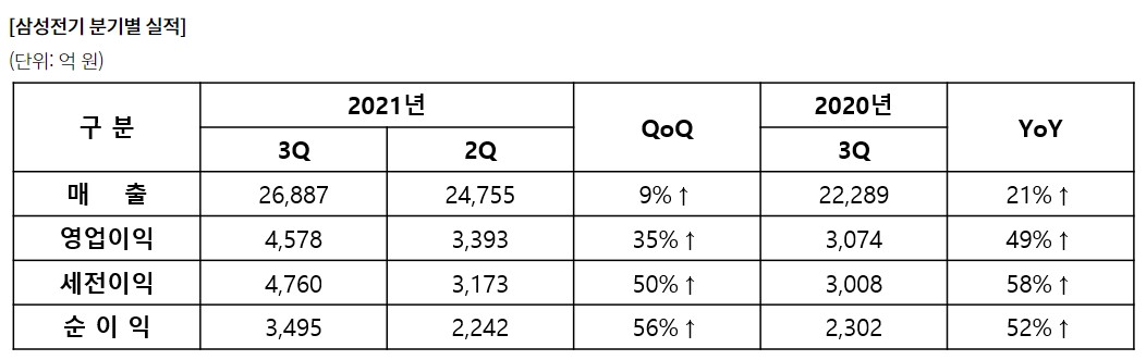 [테크월드뉴스=조명의 기자] 삼성전기는 2021년 3분기에 연결기준으로 매출 2조 6887억 원, 영업이익 4578억 원을 기록했다고 밝혔다. 전년 동기 대비 매출 4598억 원(21%), 영업이익은 1504억 원(49%) 증가했고, 전분기 대비 매출은 2132억 원(9%), 영업이익 1185억 원(35%) 늘어난 실적이다.
