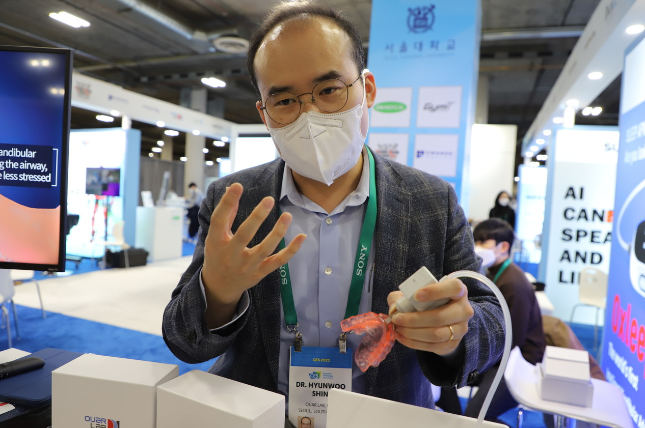 일상생활에도 영향을 미치는 코골이‧무호흡증 증상을 완화시켜주는 AI 기술이 도입되고 있다. 아워랩(OUaR LaB)이 최근 CES 2022에서 선보인 AI 기반 수면무호흡증 치료기기 ‘옥슬립(Oxleep)’을 선보여 눈길을 끌었다. 라스베이거스컨벤션센터(LVCC) 베네치안 엑스포 홀 ‘유레카 파크’에 마련된 아워랩 부스는 서울대학교 스타트업이 모인 SNU관에서 찾아볼 수 있었다.