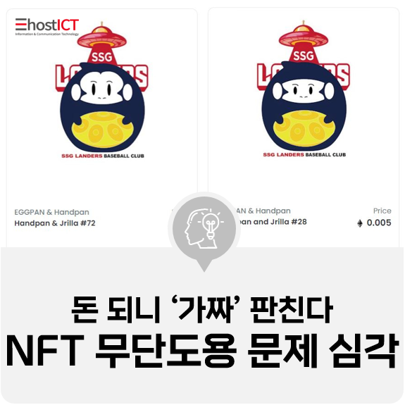 8일 글로벌 NFT 마켓 ‘오픈씨(OpenSea)’에서는 신세계푸드 캐릭터 ‘제이릴라’의 디지털 작품이 판매 중이다. 가격은 0.1 이더리움, 한화로 약 38만원이다. 비슷한 다른 디지털 작품은 0.005 이더리움, 한화로 약 1만9000원이다. 신세계그룹 야구 구단인 SSG 랜더스 앰블럼을 활용한 작품은 무려 1 이더리움, 한화 약 378만원에 거래되고 있다. 그러나 모두 누군가가 무단 도용해 불법으로 만든 ‘짝퉁’이었다. 제보를 통해 이를 파악한 신세계푸드는 오픈시 측에 저작권 침해를 이유로 삭제 요청할 방침이라고 밝혔다.