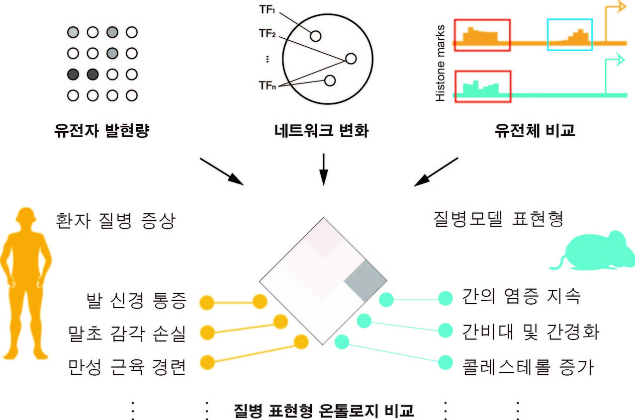 연구팀은 사람과 쥐 모델에서 관찰된 질병 증상을 모아 빅데이터로 분석했다. 기존 연구가 서로 다른 종(種) 간에 나타나는 상동 유전자의 서열을 바탕으로 진행됐던 것과 달리, 이번 연구는 조직 특이적 유전자 발현 양상과 이들이 이루는 네트워크에 주목했다.