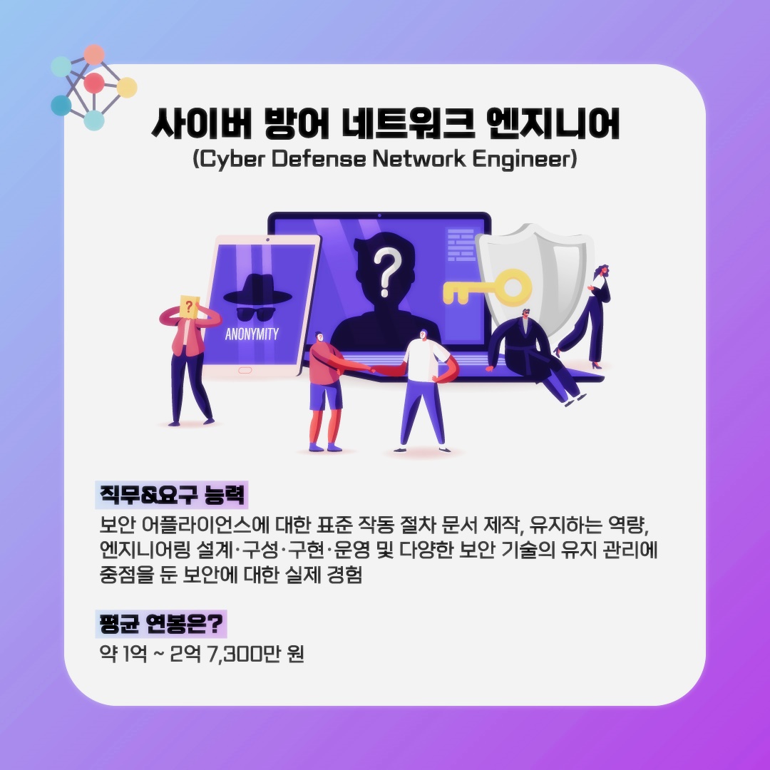 사이버 보안에 특화된 직무를 담당하게 되는 사이버 방어 네트워크 엔지니어는 보안 어플라이언스에 대한 표준 작동 절차 문서를 제작하고, 보안을 유지하는 역량을 갖추고 있어야 합니다. 엔지니어링 설계, 구성, 구현, 운영 및 다양한 보안 기술의 유지 관리에 중점을 둔 보안에 대한 실제 경험과 노하우를 겸비하고 있어야 하며 긴급한 상황에도 능동적이고 신속하게 대처할 수 있는 역량이 필요합니다.