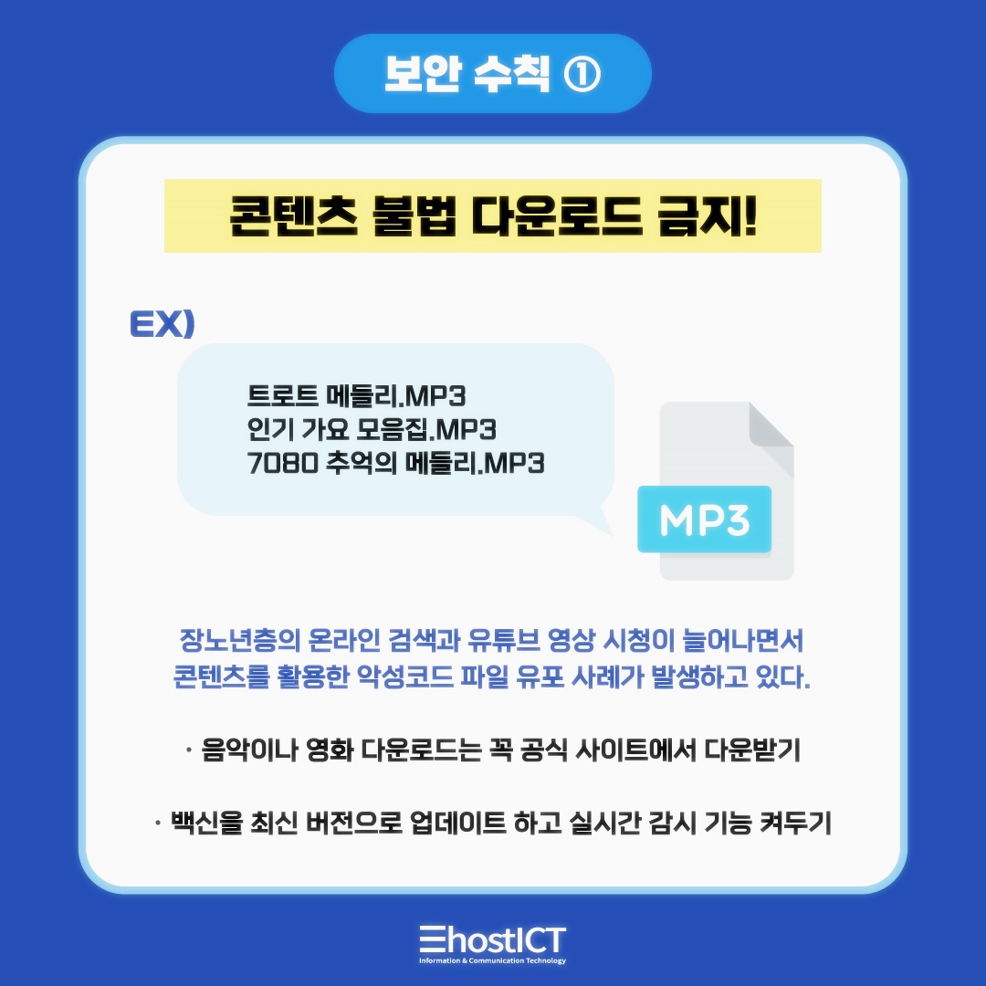 장노년층의 온라인 검색과 유튜브 영상 시청 시간이 늘면서, 콘텐츠를 활용한 악성코드 파일 유포 사례들이 발생하고 있습니다. 대게 콘텐츠 다운로드 링크인 것처럼 위장하여, 악성 코드를 심는 방식으로 이뤄지는데요. 음악이나 영화 다운로드는 꼭 공식 사이트에서 다운로드 받아야 한다는 것을 명심해야 합니다. 또한 백신을 최신 버전으로 업데이트 하고 실시간 감시 기능을 켜둬야 합니다.
