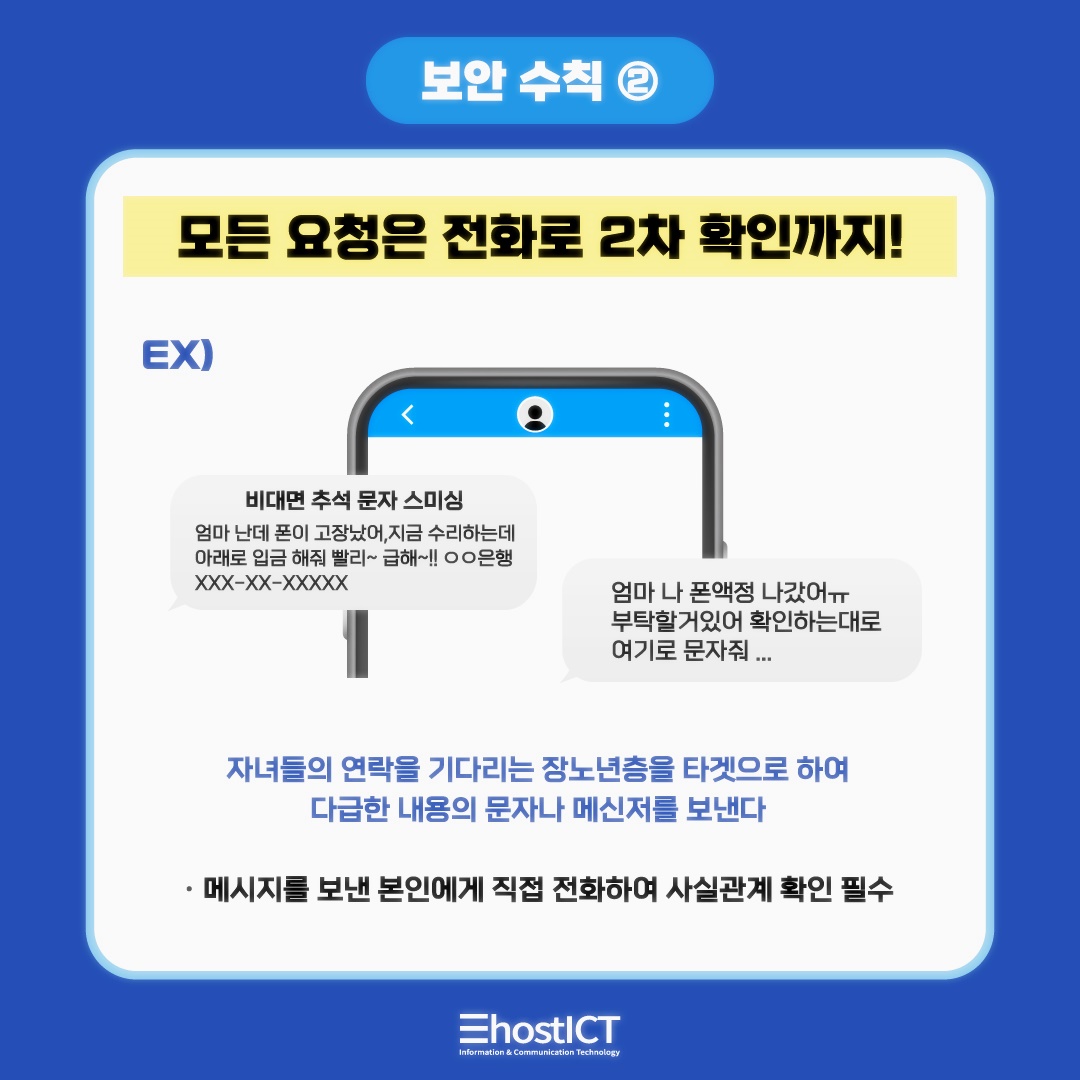 자녀, 친척, 지인 등의 연락을 기다리는 사람들을 타겟으로 하여 다급한 내용의 문자나 메신저를 보내는 금융 사이버사기 또한 고전적인 수법 중 하나입니다. 휴대폰이 고장났거나, 액정이 나갔다는 등의 근거를 제시하며 입금을 요구하는 등 뜬금없는 문자 메시지를 수신한다면, 발송자 본인에게 직접 전화 통화를 하여 2차 사실 관계 확인을 하는 것이 중요합니다.