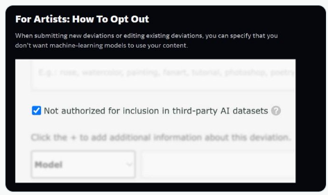 해당 데이터 세트에 포함되지 않도록 선택하면 콘텐츠 페이지의 HTML 파일에 ‘noimageai’ 플래그가 포함된다. 또한 ‘noai’ 플래그는 미디어 파일이 데비안아트의 서버에서 직접 다운로드될 때 작품을 보호한다.