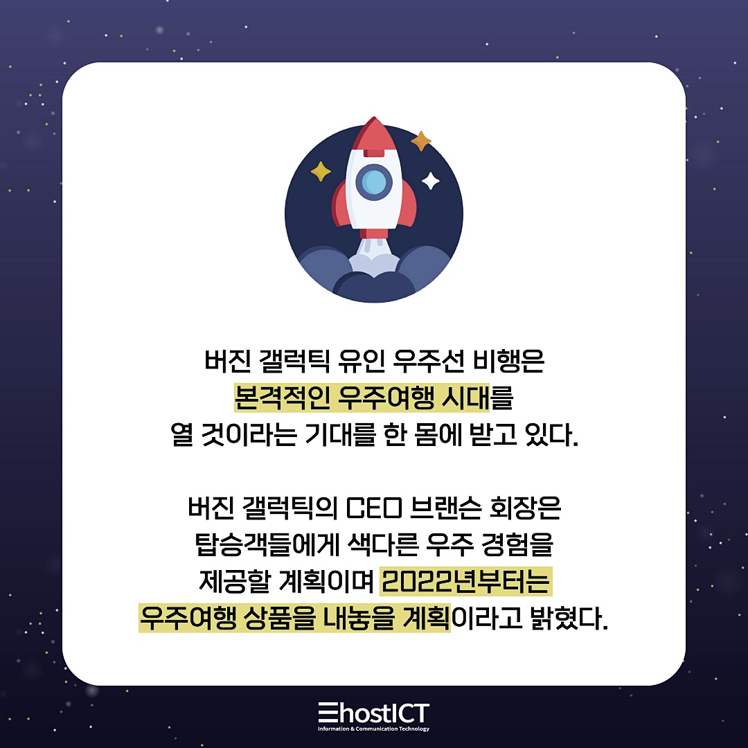 버진갤럭틱의 유인 우주선 비행 성공으로, 본격적인 민간 우주여행 시대가 개막될 것으로 예상됩니다. 버진 갤럭틱의 CEO리처드 브랜슨은 탑승객에 색다른 우주 경험을 제공하겠다고 밝혔으며, 2022년부터는 우주여행 상품을 본격적으로 서비스할 예정이라고 합니다.