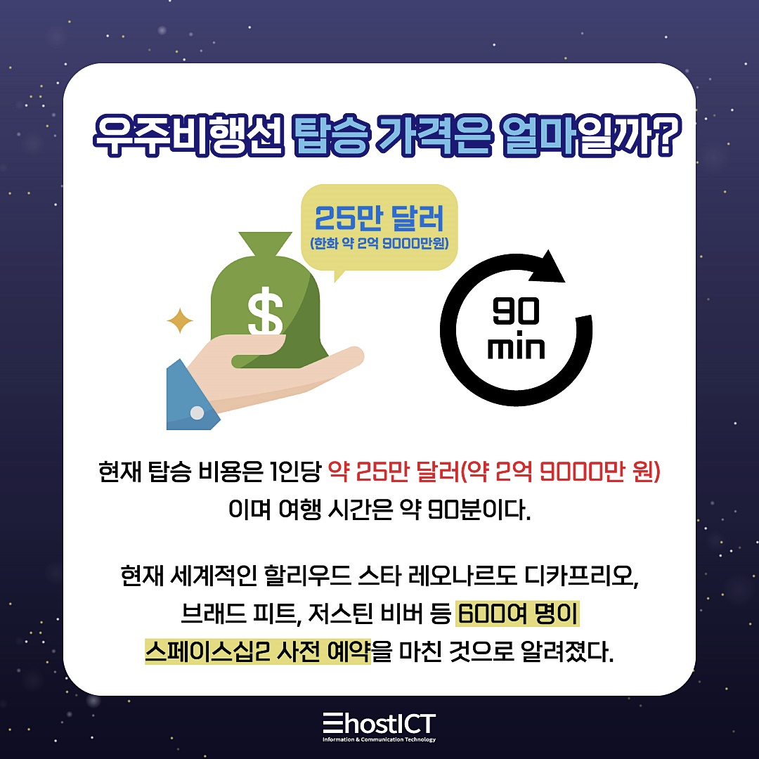 탑승 비용은 위에서 언급한 민간인 우주관광 비교 표에서 알 수 있듯, 가장 저렴한 축에 속하는데요. 현재는 1인당 약 25만 달러, 한화로 약 2억 9천만원이라고 합니다. 여행 시간은 90분인데요. 이미 레오나르도 디카프리오, 브래드 피트, 저스틴 비버 등의 유명 연예인과 부호 등 600명이 구매했을 정도로 인기가 뜨겁습니다.