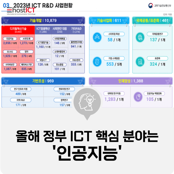 2023년 정부가 추진하는 ICT 핵심 개발 분야는 '인공지능(AI)'이다. 올해 AI 신규 연구·사업 지원액이 디지털혁신 6대 분야 중 가장 많다. AI 소프트웨어(SW) 일환으로 생긴 우주 산업까지 추가돼 지난해에 비해 연구 다양성도 늘었다.