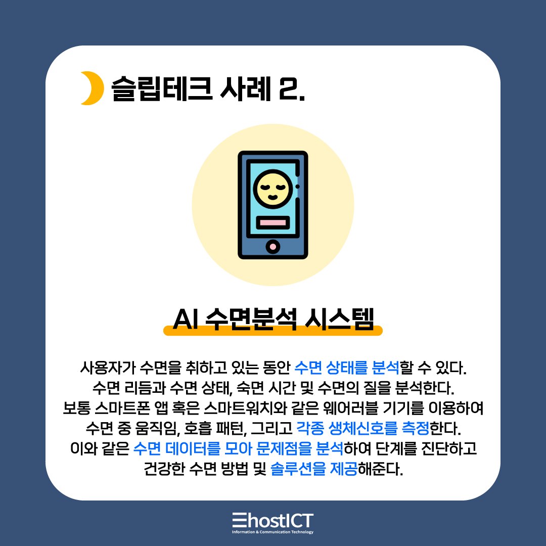 수면 장애의 원인을 파악 및 분석해서 수명의 질을 높이는 첨단 기술입니다. 즉, 첨단 기술을 이용해서 수면 상태를 분석하고 숙면을 돕는 것이 바로 Sleep-Tech인 것이죠.
