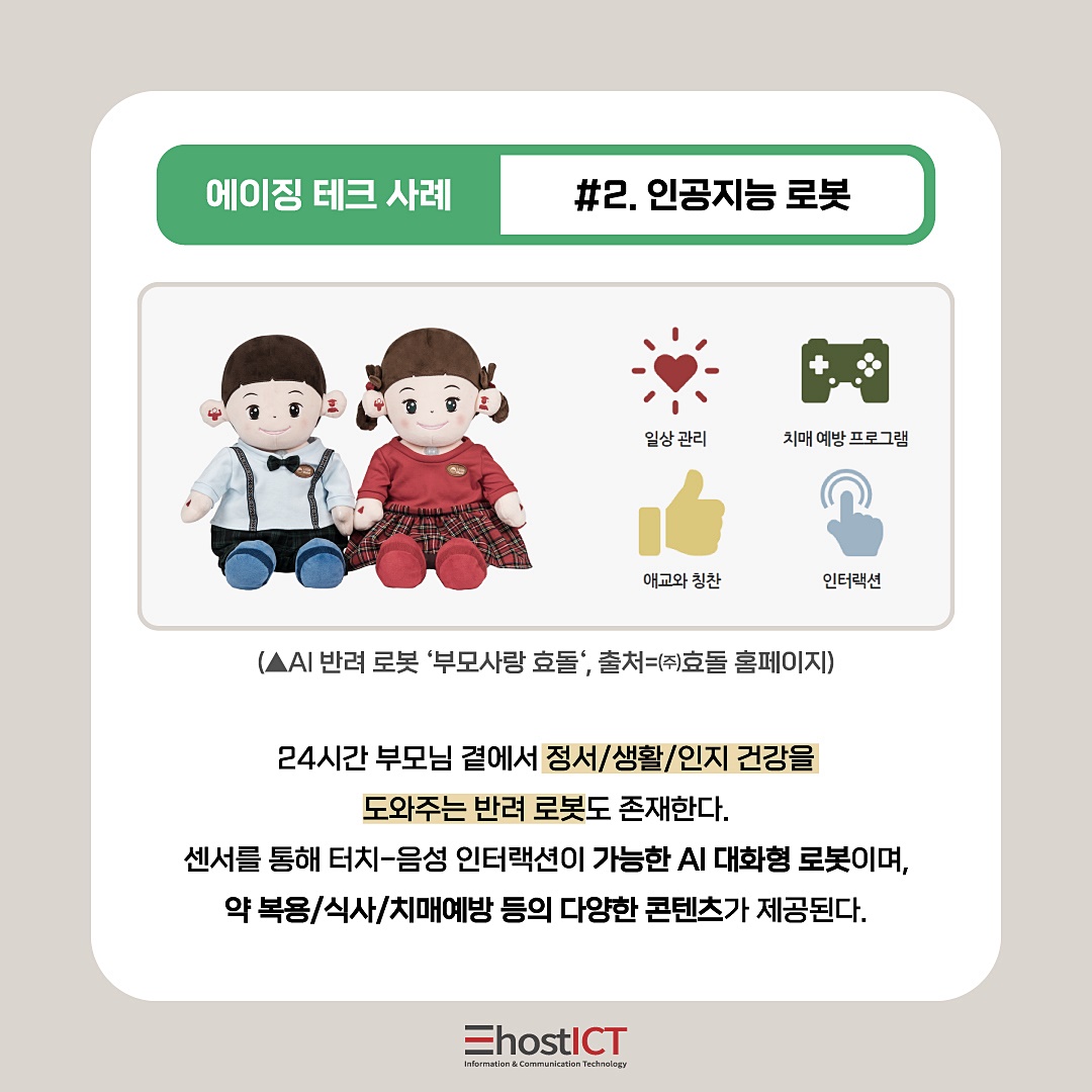 인공지능(AI)를 활용한 반려 로봇도 에이징 테크의 주 축이 되고 있는데요. AI 반려 로봇인 ‘부모사랑 효돌’은 24시간 곁에서 정서/생활/인지 건강을 도와주는 반려 로봇이라고 합니다. AI 센서가 부착 되어 있어 터치와 음성이 실시간 반응을 하는 대화형 로봇인데요. 약 복용이나 식사, 치매 예방을 위한 다양한 콘텐츠를 제공하기도 한다고 합니다. 살가운 친구가 되어 주는 인공지능 로봇이 시니어의 적적함과 외로움을 달래주는 손자, 손녀가 되어 주는 것이죠.