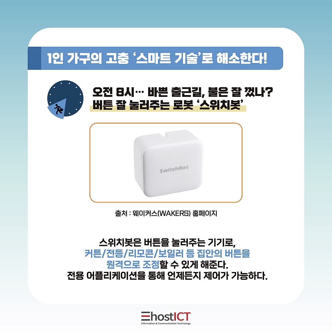 출근 시간, 집에 스위치는 잘 끄고 나왔는지 헷갈려 하루 종일 불안했던 경험 혹시 있으신가요? 바쁜 출근길에 다시 되돌아갈 수도 없고, 확인해줄 사람도 없다면 ‘밥 잘 사주는 누나’ 가 아닌 ‘버튼 잘 눌러주는 로봇’ <스위치봇>을 만나보세요.