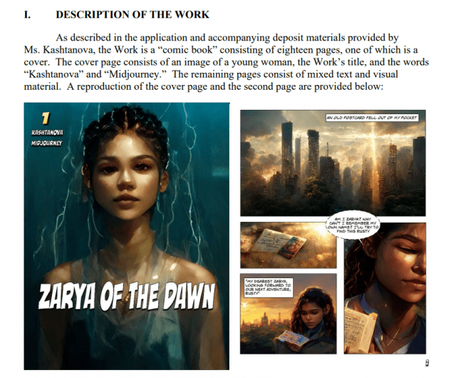 저작권을 요구한 작가는 '새벽의 자리아'라는 인터넷 소설을 쓴 크리스티나 카슈타노바다. 그는 글만 직접 쓰고 소설에 들어가는 이미지는 모두 미드저니로 만들었다.