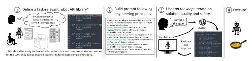 먼저 고급 로봇 API 또는 함수 라이브러리 세트를 정의한다. 이 라이브러리는 특정 로봇에 고유할 수 있으며 로봇의 제어 스택 또는 인식 라이브러리의 기존 하위 수준 구현에 매핑해야 한다. 챗GPT가 해당 동작에 대해 추론할 수 있도록 상위 수준 API에 설명이 포함된 이름을 사용하는 것이 매우 중요하다.