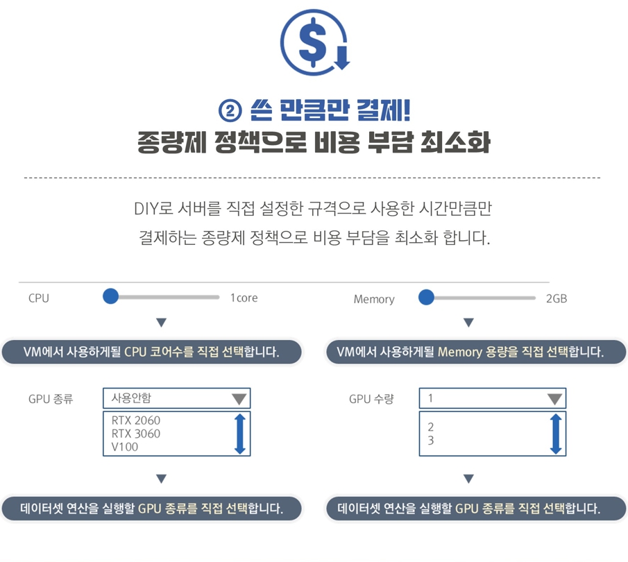 DIY로 본인에게 필요한 서버의 성능을 직접 설정한 규격으로 사용한 시간만큼만 결제하는 종량제 정책으로 비용부담을 최소화하는 빅뱅클라우드! 가상환경 내에서 CPU 코어 수와 Memory를 직접 선택하며, 데이터셋 연산을 실행할 GPU 종류와 수량을 직접 선택합니다.