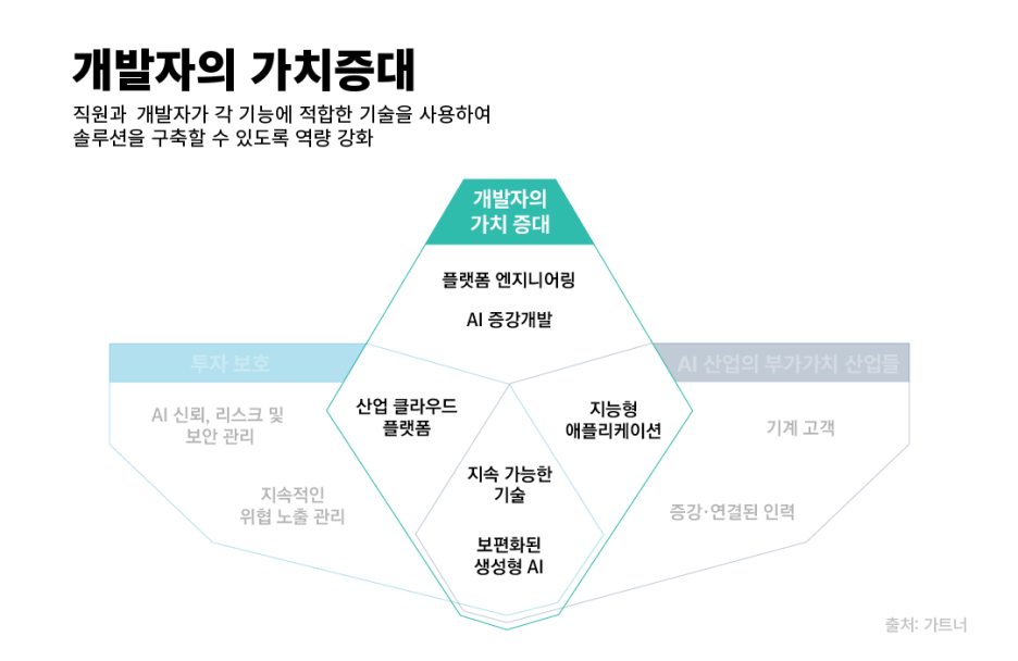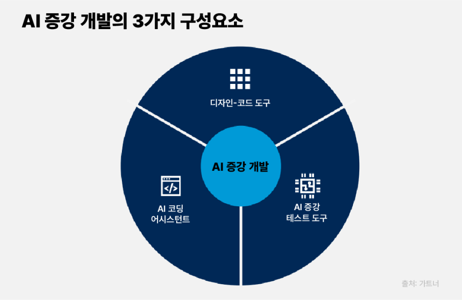 생성형AI가 등장하며 프로그래머의 일자리가 AI로 대체될 것을 우려하는 목소리가 높았는데요. 가트너는 ‘AI 증강 개발’을 언급하며 AI가 인간의 자리를 빼앗는 것이 아닌 개발자의 도우미로서 자리매김할 것이라고 예상했습니다. 특히 애플리케이션 분야의 설계, 코딩 및 테스트 과정에서 개발자의 작업 효율성 향상과 빠르고 정확한 개발을 도울 것으로 보았습니다.