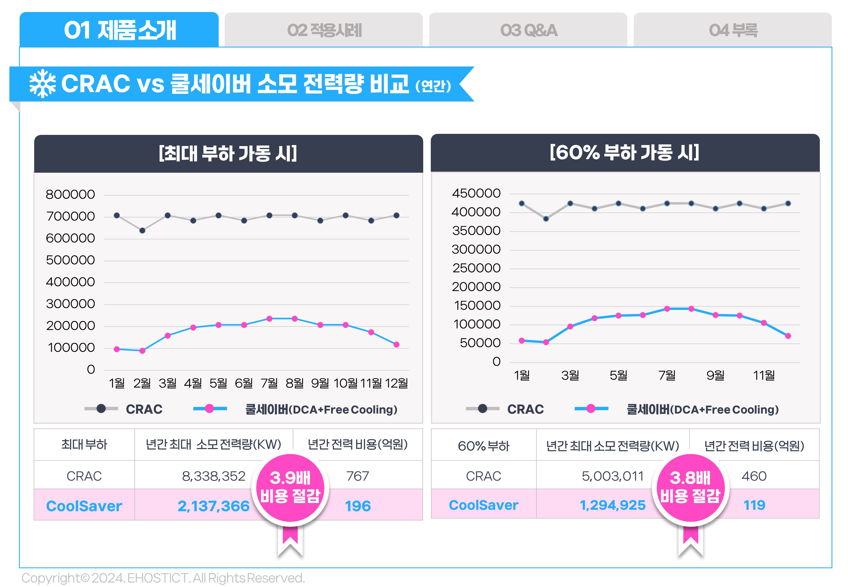 기존에 흔하게 사용하는 IDC 냉각시스템인 CRAC(Compute Room Air Conditioner)와 소모 전력량을 연간 단위로 비교해보면 위 내용과 같은데요. 부하 가동율에 따라 3.8~3.9배 가량 비용 절감이 이루어지지요.