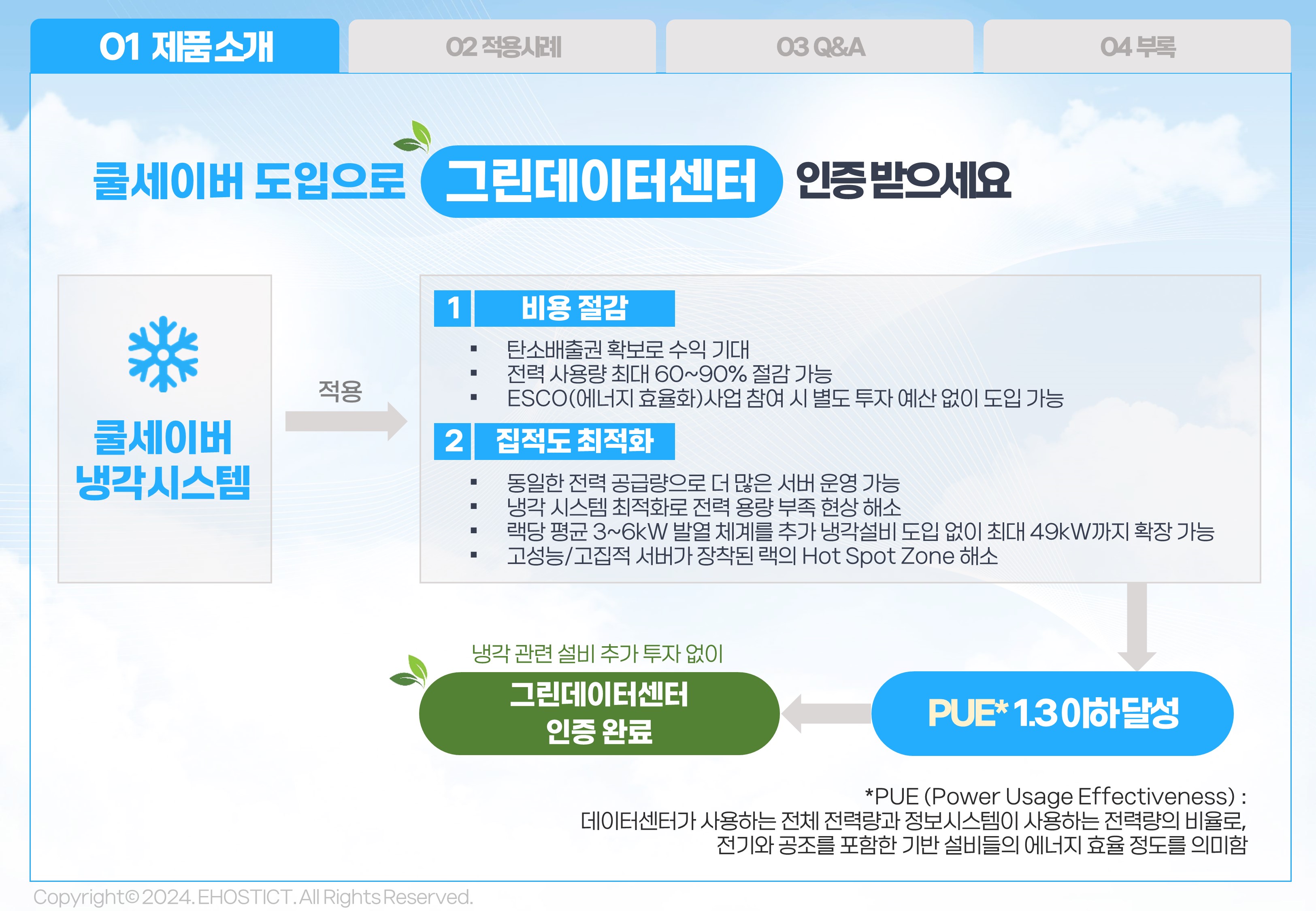 이처럼 크게 1)비용 절감 2)집적도 최적화와 같은 특장점을 지닌 쿨세이버는 PUE 1.3 이하를 달성하게 되며 냉각관련 설비의 추가 투자 없이도 '그린데이터센터' 인증이 가능토록 합니다.