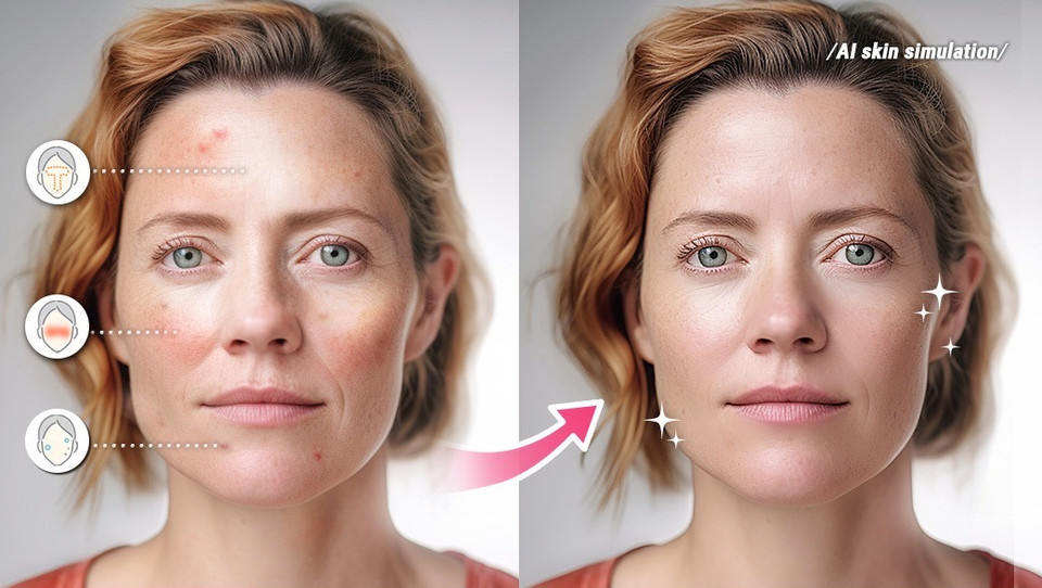 이번 AI 피부 시뮬레이션 기술 업데이트는 기존의 잡티, 다크서클, 눈밑지방, 모공, 피부결, 주름 및 홍조와 같은 7가지 피부 문제에 대한 개선 시뮬레이션을 지원하던 솔루션에 여드름, 유분, 광채를 추가하여 총 10가지 피부 고민의 시각화를 지원한다.