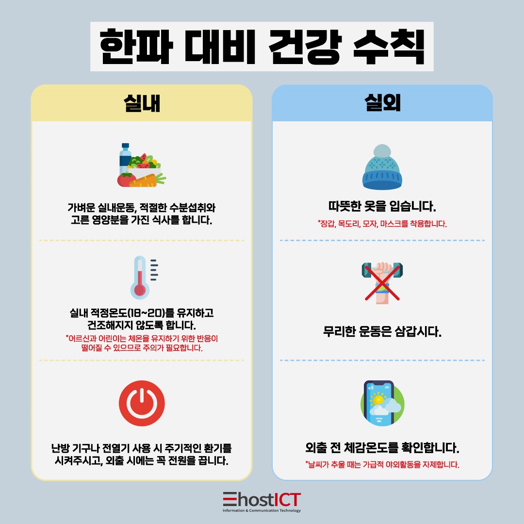 추운 겨울철에는 추위로 인해 면역력이 떨어지고, 다양한 건강 문제가 발생할 수 있기 때문에 한파에 대비하여 건강을 지키기 위한 수칙을 체계적으로 준비하는 것이 중요합니다. 한파 대비 건강 수칙을 실내외로 구분하여 각 3가지씩만 확인해보도록 하겠습니다.