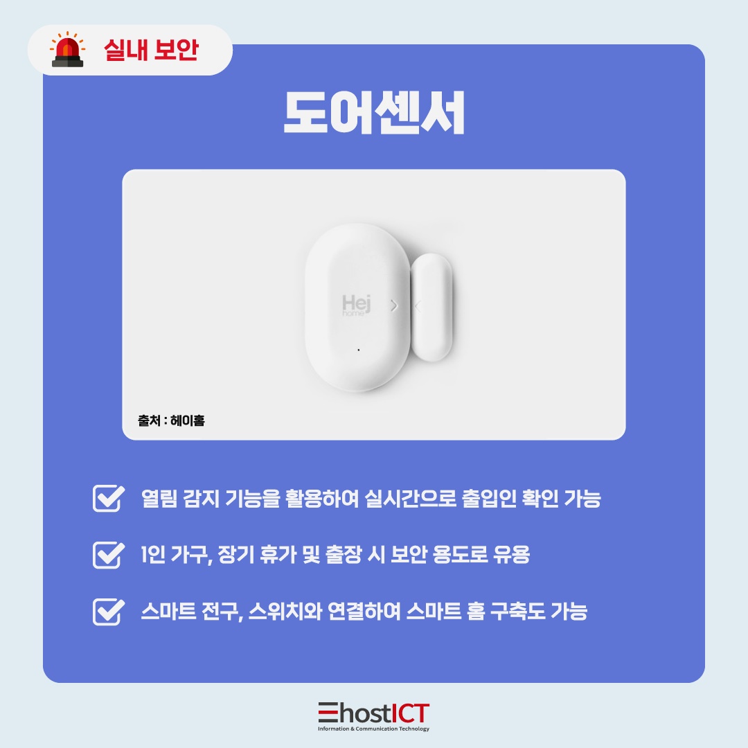 스마트 도어센서를 통해 누가 언제 출입했는지를 확인할 수 있으며, 무단침입이 발생하면 이 역시 실시간 알람을 받아볼 수 있습니다. 이 역시 가정 내 안전을 한층 더 강화해주는 기술인데요. 1인가구, 장기 휴가 및 출장 시 보안 용도로 많이 추천 하는 방식이기도 합니다. 스마트 전구나 스위치 등 IoT 연결을 하면 더 완벽한 스마트 홈 구축도 가능합니다.