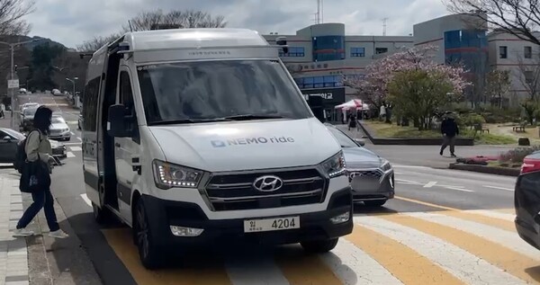 이날 오후 1시 즈음 제주대 학생회관 앞에서 차량을 호출하니 약 15분 뒤 도착했다. 네모라이드 앱에는 호출 차량의 실시간 이동 경로가 표시됐다. 점심 시간 뒤 이동이 많은 시간대라 셔틀 차량은 앞서 이용한 승객을 내려주며 길을 돌아왔다. 현재 서비스에 이용되는 차량은 15인승 솔라티다. 운전석과 조수석에 필요시 수동 주행을 하는 관리자 2명이 상주한다. 승객은 최대 12명까지 태울 수 있다.