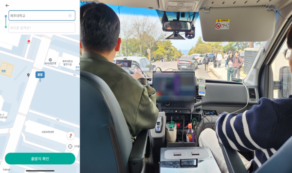 네모라이드 앱에서 셔틀 차량 호출을 위해 출발지를 설정하는 화면(왼쪽)과 제주대학교 캠퍼스에서 서행하는 셔틀차량 내부 사진. 창 밖으로 다른 차량과 보행자들이 보인다. (사진=윤상은 기자)